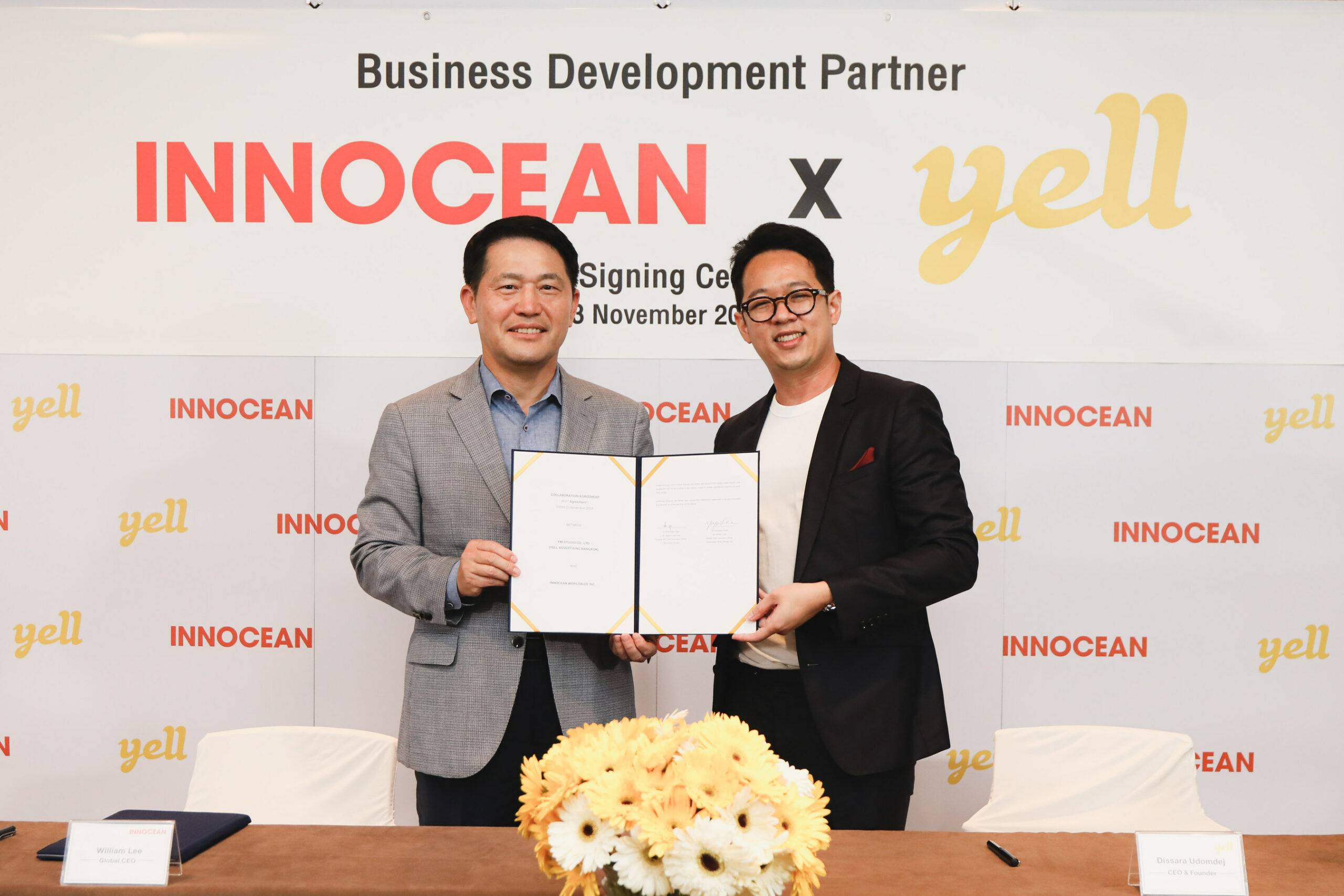 YELL首席执行官Dissara Udomdej与INNOCEAN全球首席执行官William Lee在曼谷签署了体谅备忘录,加强常识沟通、数据和资源方面的协作,以在泰国开发新的事务。